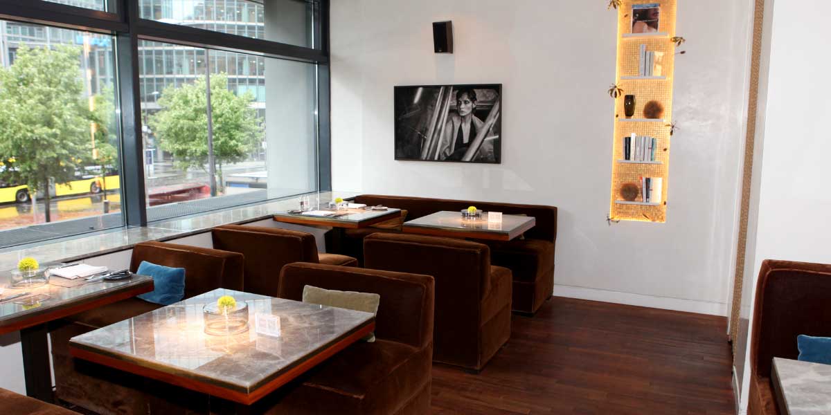 Man erreicht die loungigen Räumlichkeiten in der ersten Etage des Hotels über eine Treppe oder mittels eines Fahrstuhls – das Ambiente ist mediterran luzid wegen der großen Fenster zur Potsdamer Straße und der hohen hellen Wände. Wenige, sorgfältig ausgewählte Accessoires fangen den Blick, dazu einige New-York-Bilder des Fotokünstlers Henrique Schiefferdecker – das alles hat schon Stil.